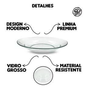 O conjunto de pratos fundos contam com um designer simples, mas elegante e sofisticado, que esbanja modernidade. Com acabamento perfeito, seu design liso combina com qualquer decoração, acessórios e utensílios de cozinha. Perfeito para o dia-a-dia ou para ocasiões especiais. Sua refeição merece toda beleza e qualidade que temos a oferecerInformações técnicas do produto:-Dimensões aproximadas do produto 1 unidade : Diâmetro 22,6cm / Profundidade 5cm/ Espessura 7mm-Composição: 100%Vidro-Validade: Indeterminada-Cor do vidro: transparente.Vantagens:- Acessível a lava-louças e microondas;- Peças feitas em vidro grosso e resistente;- Tamanho ideal para refeições;- Designer elegante que levam brilho para sua mesa.