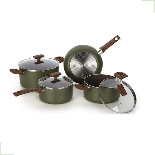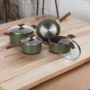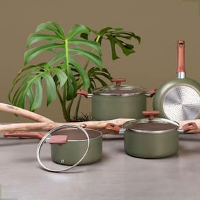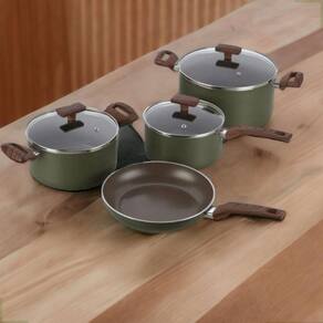 Kit Jogo De Panelas Fogão Indução 4 Peças Antiaderente Alumínio Cor: Verde-Musgo Parte do valor das vendas será revertida para um projeto de reflorestamento, assim, contribuirá para um mundo melhor e mais sustentável. Cores naturais e cabos com revestimento soft touch com aparência de madeira trazem muita suavidade e naturalidade para a cozinha. A Linha de alta espessura pode ser usada em qualquer tipo de fogão, inclusive por indução, e conta com exclusivo de revestimento Ultra 7 camadas, que confere muita resistência e durabilidade aos produtos. -ESPECIFICAÇÕES TÉCNICAS:Material: Alumínio.Fundo Triplo: Não.Revestimento: Sim, antiaderente Ultra - 7 camadas.Espessura: 3,00 mm.Tampa: Vidro temperado.Cabo: Soft Touch Antitérmico aparência de madeira .Pode ser utilizada nos fogões: elétrico, gás, vitrocerâmico e indução.Pode ser levada ao refrigerador. -CONTEÚDO DA EMBALAGEM:01 Caçarola com Tampa - Diâmetro: 20cm Capacidade: 2,9litros01 Caçarola com Tampa - Diâmetro: 24 cm Capacidade: 5,4litros01 Panela com Tampa - Diâmetro: 18cm Capacidade: 2,2litros01 Frigideira - Diâmetro: 24cm Capacidade: 1,5litros
