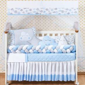 Kit Jogo Protetor Berço Menino Nuvem Com Estrela 12 PeçasContém na embalagem:1 edredom 1,30 m x 0,75 cm1 almofada nuvem 0,40 cm x 0,20 cm1 cabeceira 0,57 cm x 0,37 cm1 lateral 1,25 m x 0,25 cm1 trança 1,25 m x 0,12 cm1 lençol de cima 1,30 m x 0,90 cm1 fronha 0,28 cm x 0,38 cm1 bandô de mosqueteiro 1,40 m x 0,20 cm1 mosqueteiro 4,50 m x 1,50 m1 almofada de gota1 saia box 1,30 m x 0,70 cm.1 almofada formato estrela;Observação:Kit de berço que serve em berços padrão nacional e americanoPossui zíper para retirar os enchimentosTecido de qualidadeComposição:Tecido estampado: 100% algodãoTecido liso: 50% poliéster / 50% algodãoEnchimento = 100% poliésterMosquiteiro = 100% poliamida
