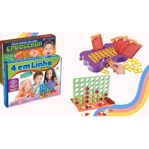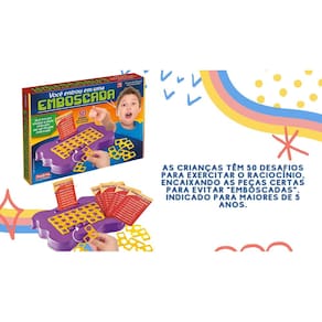 Jogo Emboscada Plasbrink – Com o Jogo Emboscada Plasbrink, as crianças contam com 50 desafios para exercitar seu raciocínio. Elas irão encaixar as peças certas para não cair em uma "emboscada"! Indicado para crianças maiores de 5 anos.
