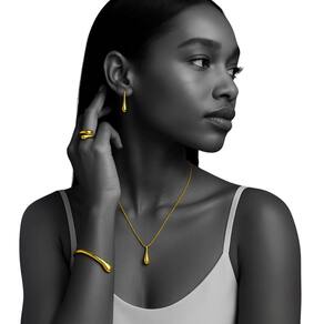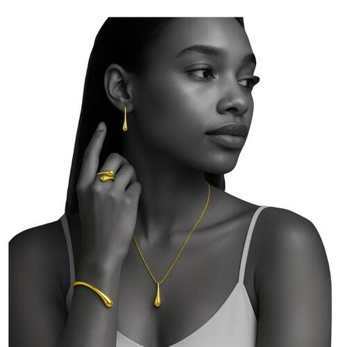 A corrente dupla com pingente em gota é delicada e marcante. O anel e os brincos seguem o mesmo padrão, criando unidade e estilo. A pulseira rígida ajustável complementa o conjunto com imponência e praticidade.