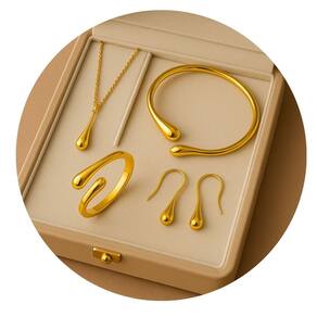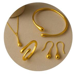 Este kit sofisticado é composto por 4 peças com design moderno e acabamento dourado, perfeito para quem busca elegância e harmonia no visual. Inspirado no formato de gotas, o conjunto traz um toque contemporâneo e minimalista, ideal para diversas ocasiões.