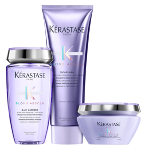 Kit com shampoo, condicionador e máscara desamareladora. Kérastase Blond Absolu Bain-Lumiére Trio deixa os cabelos fortalecidos e com brilho.