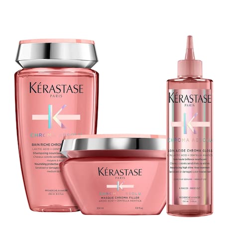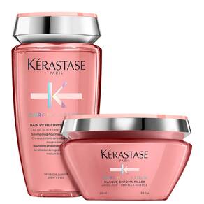 Kit para cabelos coloridos, sensibilizados ou danificados, indicado para fios médios a grossos. Kérastase Chroma Absolu Riche Respect Filler, garante hidratação e rica nutrição a partir da limpeza dos fios.