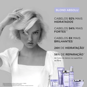 - Kérastase Blond Absolu Ultra-Violet - Máscara Desamareladora 200ml: penetra profundamente na fibra e neutraliza a cor enquanto nutre e restaura os fios.