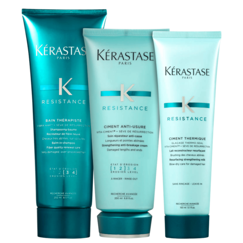 Kit com shampoo, condicionador e leave-in para cabelos danificados. O Kérastase Résistance Trio Ciment Thermique protege do calor e restaura os fios além de selar as cutículas capilares.