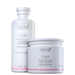 Kit com máscara e shampoo para cabelos com coloração. Keune Care Color Brillianz Intense promove limpeza e hidratação enquanto evita o desbotamento da cor.