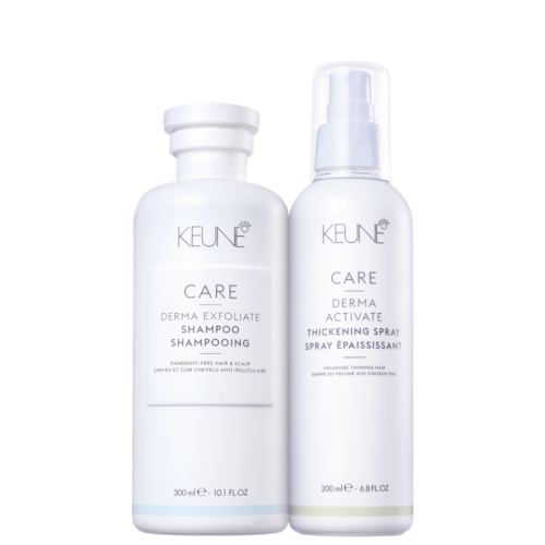 Kit de tratamento para cabelos finos e com caspa. Keune Care Derma Exfoliate Thickening limpa e cuida do couro cabeludo enquanto oferece volume para o seu visual.