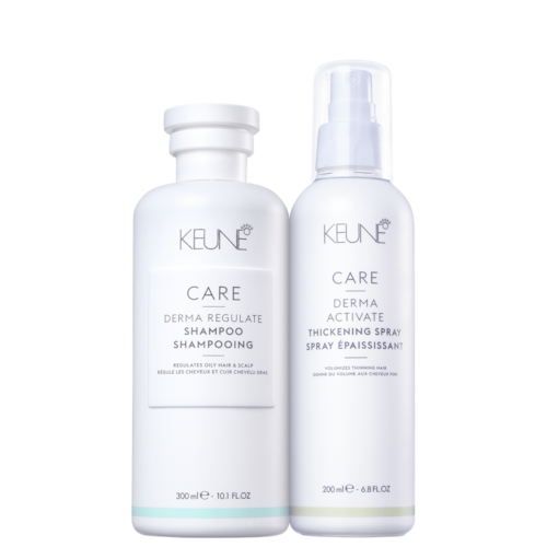 Kit com shampoo e tratamento volumador para cabelos oleosos e finos. Keune Care Derma Regulate Activate proporciona limpeza, fortalecimento e mais densidade para os fios.
