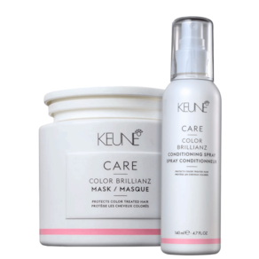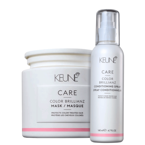 Kit com máscara e leave-in para cabelos coloridos. Keune Color Brillianz Power Duo Plus hidrata intensamente, reforça o brilho e protege a cor.