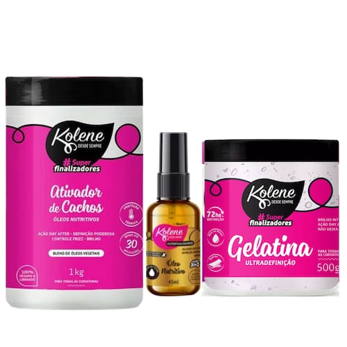 O kit é composto por: 1 Ativador de Cachos Kolene Óleos Nutritivos 1kg 1 Gelatina Kolene Ultra Definição 500g 1 Óleo Nutritivo Kolene Blend de Óleos Ação 3 em 1 45ml