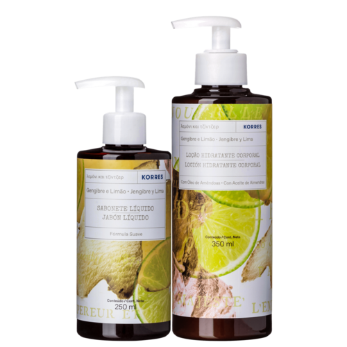 Kit com creme hidratante corporal e sabonete líquido. Korres Gengibre e Limão Sabonete & Hidratante deixa a pele agradável e com um aroma delicioso de Limão e Gengibre.