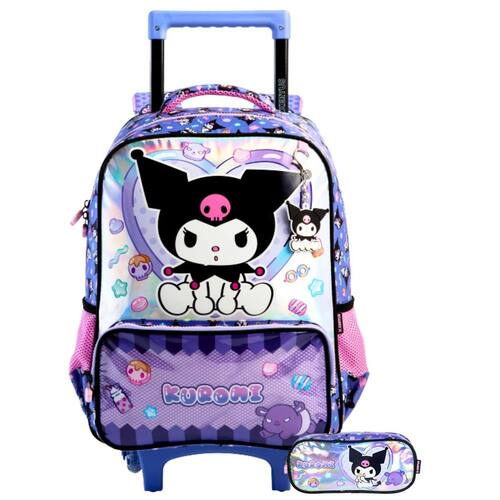 Mochila de rodinha: Produzido em poliéster Frente em pvc holográfico; Bolso frontal com mesh; Alça de costas acolchoada e regulavel; Zíper tratorado; Puxadores emborrachados personalizados; Bolsos laterais para garrafa em mesh; Carrinho com rodinhas em gel com gliter Base reforçada Acompanha chaveiro Dimensões: Largura: 30cm Altura: 40cm Comprimento: 15cm Estojo duplo: Material em poliéster Puxadores personalizados Zíper tratorado Frente holografica Cursor personalizado Dimensões: - largura: 21cm - altura: 9cm - comprimento: 07cm