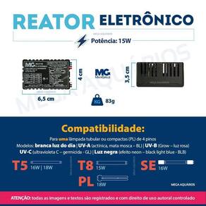 Kit lâmpada uv uv-c 15w tubular t8 germicida para esterilização de ambientes e água + reator próprio para lâmpada uv + par de soquetesLeia atentamente o anúncio antes da compraNossa lâmpada tubular germicida uv foi desenvolvida com tecnologia de ponta para garantir a mais alta qualidade e eficiência em desinfecção, é a escolha ideal para garantir um ambiente livre de germes e uma água cristalina para seu aquário ou lago.Principais características da lâmpada uv-c:Eficácia comprovada na eliminação de bactérias, vírus e outros micro-organismos nocivosA lâmpada uv-c germicida é uma poderosa ferramenta para manter ambientes saudáveisDeixa a água cristalina do lago ou aquário Pode ficar ligada 24h por diaTubular / linearTubo de quartzo transparente4 pinos, dois em cada pontaNecessita de equipamento próprio para desinfecção de ambientes ou um filtro uv para esterilização de águaNunca manuseie a lâmpada com ela ligada, não exponha olhos e pele à radiação da lâmpada. Aplicação - para que serve a lâmpada ultravioleta - uv-c germicida:Manter a água do aquário ou lago cristalina e livre de micro-organismos que possam prejudicar a saúde dos peixes e plantas.Tratamento de água e esgoto.Desinfecção de ambientes como hospitais, farmácias, restaurantes, academias, transporte público, indústrias alimentícias e outros locais que necessitam manter o ambiente seguro e livre de patógenos.Especificações técnicas lâmpada uv-c:Marca: mega aquáriosModelo: lâmpada uv uv-c germicida fluorescente ultravioleta 15wRadiação: emite radiação uv de onda com um pico de 253.7 nm uv-c Potência: 15wVoltagem: 110v / 220v pode ser ligada nas duas voltagens conforme ligação do reatorTamanho: 45cm pino a pinoDiâmetro: t8Soquete: g13Pinos: 4Formato: tubularMédia de vida útil: 8.000hPeso: 64g.Especificações e características soquete para lâmpada t8: Funciona com todos os modelos de lâmpadas de diâmetro t8, t10, t12 e lâmpadas de led desse diâmetroMarca: redyModelo: soquete base g13 tomadinha para lâmpada t8Base: g13Material: corpo em plástico pp polipropileno e contatos em latãoCorrente: 2aVoltagem: 110v ou 220v conforme ligação do reatorCor: brancoTamanho: 2,2cm de diâmetroRabicho: 12cm fio flexível 0,5mmTemperatura máxima de trabalho: 70cPeso unitário: 6g.Especificações técnicas reator para lâmpada uv:Para lâmpada de 4 pinos fluorescentePartida instantânea30% mais econômico em relação aos modelos eletromagnéticosFabricante: margiriusModelo: pg 1x15Voltagem: pode ser ligado em 110v ou 220vDimensões: 6,5 x 3,5 x 4cm larg x alt x profundidadePeso: 83gCorrente: 0,28a 127v / 0,16a 220v Potência: 18w 127v / 17w 220v Temperatura máxima de trabalho: 75c.ImportanteJamais exponha os olhos ou a pele à radiação emitida pela lâmpada uv ultravioleta, sob risco de danos gravíssimos irreversíveis aos olhos além de queimaduras na pele. A utilização de equipamentos de segurança é obrigatória.Obrigado pela visita e boas comprasAtençãoNossas imagens e textos são registrados e com direito de uso autoral controlado e reservado a essa loja e as lojas parceiras devidamente autorizadas em contrato. Marca: Mega Aquarios