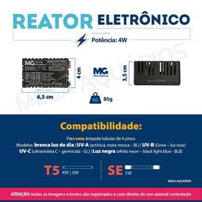 Especificações técnicas reator para lâmpada uv: Para lâmpada de 4 pinos fluorescente Partida instantânea 30% mais econômico em relação aos modelos eletromagnéticos Fabricante: margirius Modelo: pg - 1x4 Voltagem: pode ser ligado em 110v ou 220v Dimensões: 6,5 x 3,5 x 4cm larg x alt x profundidade Peso: 86g Corrente: 0,12a 127v / 0,06a 220v Potência: 6w 127v / 4,5w 220v Temperatura máxima de trabalho: 75c.