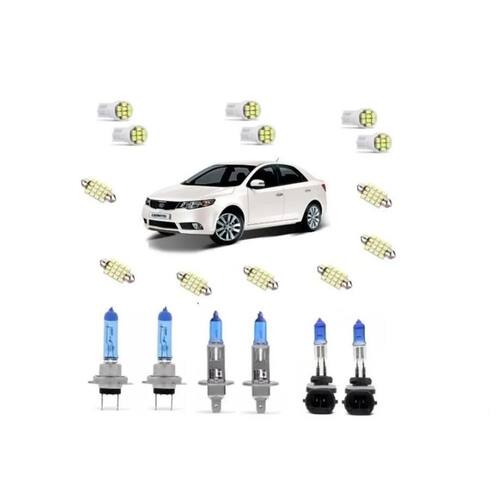 Kit lâmpadas super branca + leds farol/milha kia cerato Kit lampadas super branca + leds farol/milha kia cerato 2009 á 2012. Esta lâmpada emite luz com exclusiva temperatura de cor 8500k, gerando iluminação na cor super branca de tom azulado. O tom amarelado das lâmpadas vai dar lugar ao branco azulado produzindo o efeito esportivo. Ela permite que você dirija com mais segurança e conforto, devido a maior visibilidade alcançada através da luz . A lâmpada utiliza as conexões do seu carro sem precisar de adaptações ou relês, além de ter o mesmo consumo de lâmpadas convencionais. Principais características: Lâmpada automotiva h7 h1 h27 Potência: 55w/60w Lâmpada super branca com efeito esportivo Brilho 30% maior que lâmpadas comuns. Dados técnicos: Cor de emissão: branca Potência: 55w/60w Tipo: h7 h1 h27 Voltagem: 12v carro Marca: tech one Homologado inmetro Itens inclusos: 02 - lâmpadas h7 super brancas farol baixo 02 - lâmpadas h1 super brancas farol alto 02 - lâmpadas h27 super brancas farol de milha Kit composto: 02 x lâmpadas t10 08 led's - luz de farolete/meia luz 02 x lâmpadas torpedo 31mm 16 led's - luz de teto dianteiro 02 x lâmpadas torpedo 31mm 16 led's - quebra sol 01 x lâmpadas torpedo 31mm 16 led's - porta malas 01 x lâmpadas torpedo 31mm 16 led's - porta luvas 01 x lâmpadas torpedo 31mm 16 led's - luz de teto traseiro 02 x lâmpadas t10 08 led's - luz de placa 02 x lâmpadas t10 08 led's - luz de ré Marca: Não Informado
