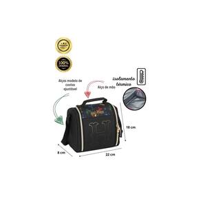Lancheira: Confeccionada em Poliéster Isolamento térmico Alça de mão Alça que prende na mochila de rodinhas Design exclusivo Puxadores personalizados Fechamento em zíper Medidas aproximadas: Altura: 20 cm Largura: 12 cm Comprimento: 22 cm