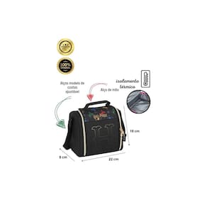 Lancheira: Confeccionada em Poliéster Isolamento térmico Alça de mão Alça que prende na mochila de rodinhas Design exclusivo Puxadores personalizados Fechamento em zíper Medidas aproximadas: Altura: 20 cm Largura: 12 cm Comprimento: 22 cm Garrafa: Possui uma tampa plástica e válvula antivazamentos; Material: Aço inoxidável