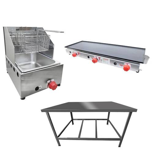 Esse Kit conta com Mesa de Manipulação para você preparar os alimentos, Fritadeira para fritura de suas porções e uma Chapa para preparação do seu cardápio!