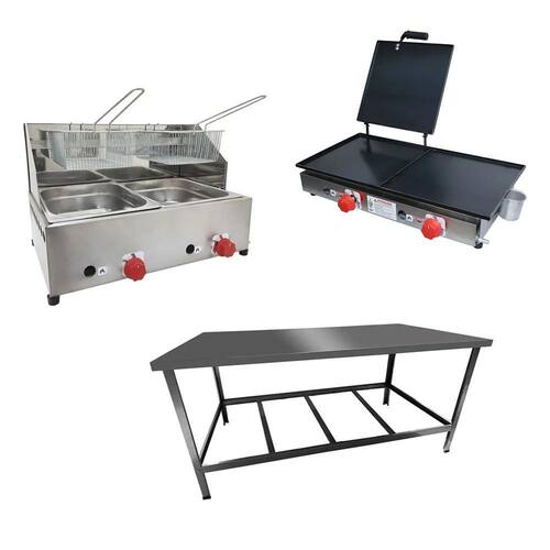 Esse Kit conta com Mesa de Manipulação para você preparar os alimentos, Fritadeira para fritura de suas porções e uma Chapa para preparação do seu cardápio!