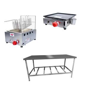 Esse Kit conta com Mesa de Manipulação para você preparar os alimentos, Fritadeira para fritura de suas porções e uma Chapa para preparação do seu cardápio!