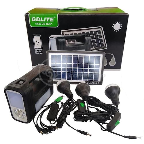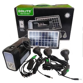 Kit Lanterna Placa Solar Carregador Portatil Energia Nº 12 Gdlite -A energia solar fornece corrente contínua para iluminação e carregamento de dispositivos móveis. Além de ser útil em momentos de necessidade, o sistema solar também é útil para eventos ao ar livre e viagens noturnas. Ele também vem com um painel solar com lanternas, lâmpadas LED e uma Placa solar. -utilizando energia solar renovável, este dispositivo de iluminação é obrigatório durante apagões e situações de emergência. Este dispositivo também é fácil de usar, muito intuitivo e pratico. Também foi comprovado que não há ruído, permitindo que você aprecie as atividades ao ar livre ou a paz e tranquilidade da noite. Características do Produto Cor: Preto Capacidade: 4500mAh Potência: 20w Entrada USB para carregar celulares ou outros equipamentos Material: Polipropileno e Componentes Eletrônicos. Produto 100% autêntico e de alta qualidade Possui indicador de nível de bateria Carregamento Adaptador de Tomada: Bivolt 110/220V - 50 / 60Hz Carregamento também por Placa Solar Entrada: DC 6V Saída: DC 9V Saída USB: 4x 5V = 0,5A Tempo de carregamento: 8-10 horas Tempo de Recarga no Sol: 12hs Tempo de trabalho: 7 à 12 horas A Lâmpada Led É 90 Lumens, A Luz Lateral É 150 Lumens Quantidade de Leds Lâmpada Bulbo: 8 Potência Lâmpada Bulbo: 3W Dimensões Altura x Largura x Comprimento : Medidas Placa Solar: 2 cm x 14 cm x 26 cm Medidas Lâmpada Bulbo: 9cm x 6cm Comprimento Cabo da Lâmpada Bulbo: 3 metros 40 cm Comprimento Cabo Fonte Controle Principal: 50 cm Conteúdo da embalagem 1 Controle Principal Acoplado no Painel , com entradas para Lâmpadas, Fontes, USB, Liga/Desliga. 3 Lâmpadas Bulbo 1 Placa Solar 1 Cabo USB 5 EntradasNº Certificado INMETRO: BR34048003Certificador: BVQI Marca: Gdlite
