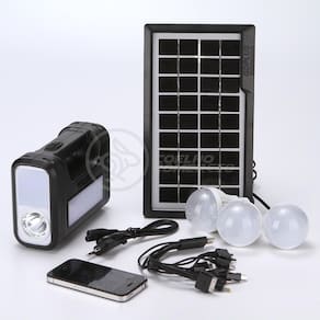 Kit Lanterna Placa Solar Carregador Portatil Energia Nº 2 Gdlite -A energia solar fornece corrente contínua para iluminação e carregamento de dispositivos móveis. Além de ser útil em momentos de necessidade, o sistema solar também é útil para eventos ao ar livre e viagens noturnas. Ele também vem com um painel solar com lanternas, lâmpadas LED e uma Placa solar. -utilizando energia solar renovável, este dispositivo de iluminação é obrigatório durante apagões e situações de emergência. Este dispositivo também é fácil de usar, muito intuitivo e pratico. Também foi comprovado que não há ruído, permitindo que você aprecie as atividades ao ar livre ou a paz e tranquilidade da noite. Características do Produto Cor: Preto Capacidade: 4500mAh Potência: 20w Entrada USB para carregar celulares ou outros equipamentos Material: Polipropileno e Componentes Eletrônicos. Produto 100% autêntico e de alta qualidade Possui indicador de nível de bateria Carregamento Adaptador de Tomada: Bivolt 110/220V - 50 / 60Hz Carregamento também por Placa Solar Entrada: DC 6V Saída: DC 9V Saída USB: 4x 5V = 0,5A Tempo de carregamento: 8-10 horas Tempo de Recarga no Sol: 12hs Tempo de trabalho: 7 à 12 horas A Lâmpada Led É 90 Lumens, A Luz Lateral É 150 Lumens Quantidade de Leds Lâmpada Bulbo: 8 Potência Lâmpada Bulbo: 3W Dimensões Altura x Largura x Comprimento : Medidas Placa Solar: 2 cm x 14 cm x 26 cm Medidas Lâmpada Bulbo: 9cm x 6cm Comprimento Cabo da Lâmpada Bulbo: 3 metros 40 cm Comprimento Cabo Fonte Controle Principal: 50 cm Conteúdo da embalagem 1 Controle Principal Acoplado no Painel , com entradas para Lâmpadas, Fontes, USB, Liga/Desliga. 3 Lâmpadas Bulbo 1 Placa Solar 1 Cabo USB 5 EntradasNº Certificado INMETRO: BR34048003Certificador: BVQI Marca: Gdlite