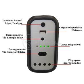 Kit Lanterna Placa Solar Carregador Portatil Energia Nº 8 Gdlite -A energia solar fornece corrente contínua para iluminação e carregamento de dispositivos móveis. Além de ser útil em momentos de necessidade, o sistema solar também é útil para eventos ao ar livre e viagens noturnas. Ele também vem com um painel solar com lanternas, lâmpadas LED e uma Placa solar. -utilizando energia solar renovável, este dispositivo de iluminação é obrigatório durante apagões e situações de emergência. Este dispositivo também é fácil de usar, muito intuitivo e pratico. Também foi comprovado que não há ruído, permitindo que você aprecie as atividades ao ar livre ou a paz e tranquilidade da noite. Características do Produto Cor: Preto Capacidade: 4500mAh Potência: 20w Entrada USB para carregar celulares ou outros equipamentos Material: Polipropileno e Componentes Eletrônicos. Produto 100% autêntico e de alta qualidade Possui indicador de nível de bateria Carregamento Adaptador de Tomada: Bivolt 110/220V - 50 / 60Hz Carregamento também por Placa Solar Entrada: DC 6V Saída: DC 9V Saída USB: 4x 5V = 0,5A Tempo de carregamento: 8-10 horas Tempo de Recarga no Sol: 12hs Tempo de trabalho: 7 à 12 horas A Lâmpada Led É 90 Lumens, A Luz Lateral É 150 Lumens Quantidade de Leds Lâmpada Bulbo: 8 Potência Lâmpada Bulbo: 3W Dimensões Altura x Largura x Comprimento : Medidas Placa Solar: 2 cm x 14 cm x 26 cm Medidas Lâmpada Bulbo: 9cm x 6cm Comprimento Cabo da Lâmpada Bulbo: 3 metros 40 cm Comprimento Cabo Fonte Controle Principal: 50 cm Conteúdo da embalagem 1 Controle Principal Acoplado no Painel , com entradas para Lâmpadas, Fontes, USB, Liga/Desliga. 3 Lâmpadas Bulbo 1 Placa Solar 1 Cabo USB 5 EntradasNº Certificado INMETRO: BR34048003Certificador: BVQI Marca: Gdlite