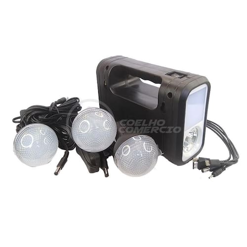 Kit Lanterna Placa Solar Carregador Portatil Energia Emergência Painel Lampadas Acampamento Camping Gdlite -A energia solar fornece corrente contínua para iluminação e carregamento de dispositivos móveis. Além de ser útil em momentos de necessidade, o sistema solar também é útil para eventos ao ar livre e viagens noturnas. Ele também vem com um painel solar com lanternas, lâmpadas LED e uma Placa solar. -utilizando energia solar renovável, este dispositivo de iluminação é obrigatório durante apagões e situações de emergência. Este dispositivo também é fácil de usar, muito intuitivo e pratico. Também foi comprovado que não há ruído, permitindo que você aprecie as atividades ao ar livre ou a paz e tranquilidade da noite. Características do Produto Cor: Preto Capacidade: 4500mAh Potência: 20w Entrada USB para carregar celulares ou outros equipamentos Material: Polipropileno e Componentes Eletrônicos. Produto 100% autêntico e de alta qualidade Possui indicador de nível de bateria Carregamento Adaptador de Tomada: Bivolt 110/220V - 50 / 60Hz Carregamento também por Placa Solar Entrada: DC 6V Saída: DC 9V Saída USB: 4x 5V = 0,5A Tempo de carregamento: 8-10 horas Tempo de Recarga no Sol: 12hs Tempo de trabalho: 7 à 12 horas A Lâmpada Led É 90 Lumens, A Luz Lateral É 150 Lumens Quantidade de Leds Lâmpada Bulbo: 8 Potência Lâmpada Bulbo: 3W Dimensões Altura x Largura x Comprimento : Medidas Placa Solar: 2 cm x 14 cm x 26 cm Medidas Lâmpada Bulbo: 9cm x 6cm Comprimento Cabo da Lâmpada Bulbo: 3 metros 40 cm Comprimento Cabo Fonte Controle Principal: 50 cm Conteúdo da embalagem 1 Controle Principal Acoplado no Painel , com entradas para Lâmpadas, Fontes, USB, Liga/Desliga. 3 Lâmpadas Bulbo 1 Placa Solar 1 Cabo USB 5 Entradas