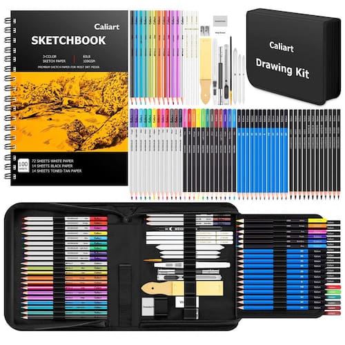 Tudo em um kit de arte O conjunto de lápis de desenho Premium inclui 12 lápis de grafite, 12 lápis de cor, 12 lápis de aquarela, 12 lápis de carvão, 3 lápis de carvão branco, 12 lápis metálicos, 3 tocos de papel de mistura, caneta de pincel de água recarregável, estojo de viagem e mais Cada lápis é marcado com nome e número de cor e pré afiado. 76 peças de acessórios de ferramentas de arte mais um bloco de desenho de 100 folhas, total de 176 peças Perfeito para desenhar, esboçar, sombrear, misturar.