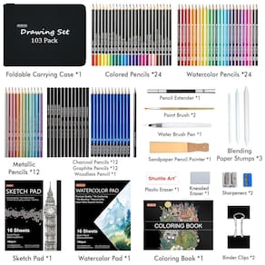 KIT DE DESENHO COMPLETO O conjunto de desenho do pacote Shuttle Art 103 vem com 24 lápis de cor, 24 lápis de aquarela, 12 lápis de cor metálica, 12 lápis de grafite, 12 lápis de carvão, 1 extensor de lápis, 1 ponteiro de lápis de lixa, 3 tocos de papel de mistura, 1 bloco de desenho , 1 bloco de aquarela, 1 livro para colorir, 1 apontador de furo duplo, 1 apontador de plástico, 1 caneta de pincel de água, 2 clipes de fichário, 2 pincéis, 1 borracha de plástico, 1 borracha amassada, 1 estojo dobrável e 1 manual do usuário, 103 pacotes no total.