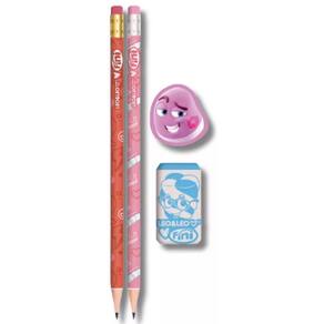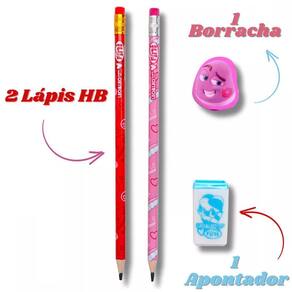 O kit contém: 2 lápis grafite nº 2 / hb com mina de 2,2 mm, macia e resistente, perfeitos para escrever ou desenhar. 1 apontador com depósito para manter tudo organizado e sem sujeira. 1 borracha com formato único e divertido, ideal para corrigir e apagar com facilidade.