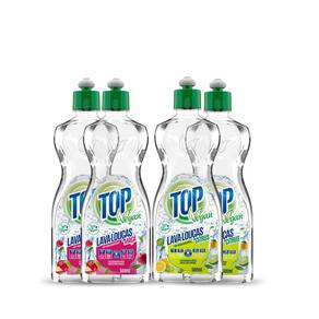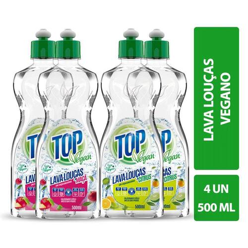 O TOP Vegan Lava Louças Maça e TOP Vegan Lava Louças Citrus concentrado são prontos para uso, tendo um maior rendimento. Um produto de pH neutro, elaborado com matérias primas naturais de origem vegetal. Possui uma fórmula inovadora e com controle de espuma. Produto Dermatologicamente Testado com fragrância suave, odor agradável e sem corante. Modo de usar: Aplique o produto em uma esponja úmida, esfregue a área a ser limpa.