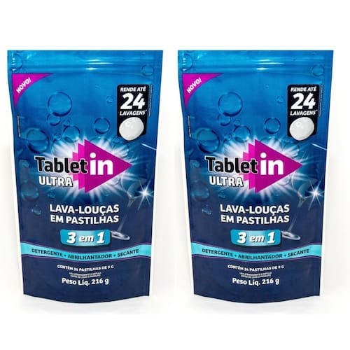 Tecnologia inovadora; Dispensa o uso do Secante; Uma única pastilha funciona como detergente, abrilhantador e secante; Um pacote faz até 24 lavagens*, para máquinas de até 8 serviços; Contém tensoativos de última geração; *Retirar o secante da máquina antes de usar o Tabletin Lava-Louças 3x1*