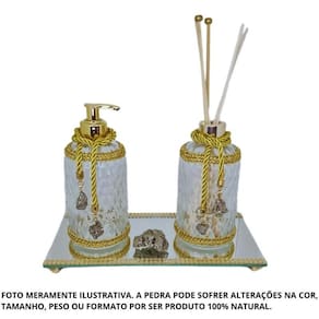 Kit lavabo pedra natural difusor saboneteira-escolha a pedra Cor: pirita dourada Kit lavabo pedra natural difusor saboneteira-escolha a pedra escolha uma das cores disponíveis na opção cor do próprio anúncio. - turmalina negra: é uma pedra natural de proteção, limpeza, purificação e transformação das energias do ambiente. Essa pedra vai te proteger contra o mau-olhado e todas as energias negativas que de alguma forma atingirem o seu lar. Blinda o seu ambiente da sobrecarga energética e dispersa toda a tensão e o do ambiente. - pirita dourada: a pedra pirita é muito conhecida pela sua força em atrair prosperidade e é muito Utilizado por aqueles que procuram sucesso , bens materiais, abertura de caminhos. Traz a energia da prosperidade intensa ao ambiente que se encontra. - ametista roxa: a pedra ametista é o cristal da paz, da evolução espiritual e da conscientização. É uma pedra , pois ajuda a controlar os vícios, os maus hábitos, a dor, a ansiedade e a insônia. Estimula a entrada e aprofundamento em assuntos de espiritualidade, eleva o padrão vibratório da aura, dando equilíbrio geral e harmonia. Traz paz e equilíbrio ao ambiente. - quartzo verde: o quartzo verde é considerado a pedra da cura pelas propriedades calmantes e desintoxicantes de sua cor. Ele é capaz de acalmar o corpo, mente e coração, aumentando nossa paciência, favorecendo o equilíbrio emocional, sensação de bem-estar e também o sono. - sodalita azul: a sodalita é uma pedra de elevação espiritual, meditação e proteção energética. Também fortalece a mente, aumenta a intuição, facilita a meditação. As vibrações da pedra sodalita ajudam a expandir nossa consciência espiritual, acalmam as emoções e equilibram nossa energia mental. O kit lavabo é composto por uma pedra natural turmalina negra tamanho médio além dos pingentes de pedras turmalinas pequenas, bandeja espelhada, saboneteira e difusor, sendo que todas as peças são de vidro e decoradas de forma artesanal proporcionando requinte e delicadeza em peças de beleza única. Enviamos seu pedido em até 24 horas após a confirmação de pagamento Marca: Não Informado Ean: 7894135787829