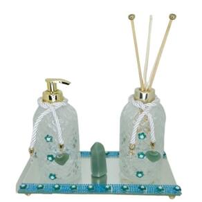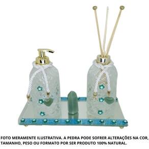 Kit lavabo pedra natural difusor saboneteira-escolha a pedra Cor: quartzo verde Kit lavabo pedra natural difusor saboneteira-escolha a pedra escolha uma das cores disponíveis na opção cor do próprio anúncio. - turmalina negra: é uma pedra natural de proteção, limpeza, purificação e transformação das energias do ambiente. Essa pedra vai te proteger contra o mau-olhado e todas as energias negativas que de alguma forma atingirem o seu lar. Blinda o seu ambiente da sobrecarga energética e dispersa toda a tensão e o do ambiente. - pirita dourada: a pedra pirita é muito conhecida pela sua força em atrair prosperidade e é muito Utilizado por aqueles que procuram sucesso , bens materiais, abertura de caminhos. Traz a energia da prosperidade intensa ao ambiente que se encontra. - ametista roxa: a pedra ametista é o cristal da paz, da evolução espiritual e da conscientização. É uma pedra , pois ajuda a controlar os vícios, os maus hábitos, a dor, a ansiedade e a insônia. Estimula a entrada e aprofundamento em assuntos de espiritualidade, eleva o padrão vibratório da aura, dando equilíbrio geral e harmonia. Traz paz e equilíbrio ao ambiente. - quartzo verde: o quartzo verde é considerado a pedra da cura pelas propriedades calmantes e desintoxicantes de sua cor. Ele é capaz de acalmar o corpo, mente e coração, aumentando nossa paciência, favorecendo o equilíbrio emocional, sensação de bem-estar e também o sono. - sodalita azul: a sodalita é uma pedra de elevação espiritual, meditação e proteção energética. Também fortalece a mente, aumenta a intuição, facilita a meditação. As vibrações da pedra sodalita ajudam a expandir nossa consciência espiritual, acalmam as emoções e equilibram nossa energia mental. O kit lavabo é composto por uma pedra natural turmalina negra tamanho médio além dos pingentes de pedras turmalinas pequenas, bandeja espelhada, saboneteira e difusor, sendo que todas as peças são de vidro e decoradas de forma artesanal proporcionando requinte e delicadeza em peças de beleza única. Enviamos seu pedido em até 24 horas após a confirmação de pagamento Marca: Não Informado