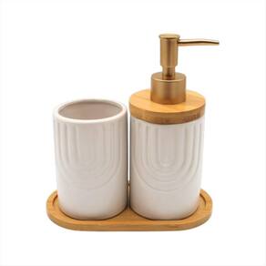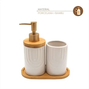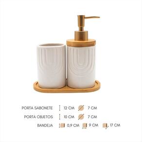 Design moderno para um ambiente sofisticado Se você busca um toque contemporâneo e ousado para o seu lavabo, o Kit Lavabo Geométrico é a escolha perfeita. Seu design possui um elegante relevo de arcos traz uma estética arquitetônica moderna, transformando seu espaço com requinte e personalidade. Destaques do design: Textura geométrica em alto-relevo - um detalhe refinado que valoriza qualquer decoração Acabamento fosco sofisticado - toque aveludado e visual luxuoso Base de bambu natural - equilíbrio perfeito entre modernidade e aconchego Ideal para lavabos que valorizam um estilo moderno, sofisticado e cheio de personalidade. Especificações Técnicas: Disponibilidade nas cores: Preto / Branco - Porta Sabonete Líquido Material: Porcelana e Bambu Medidas Aproximadas: Altura: 12 cm x Diâmetro: 7cm - Porta Objetos Material: Porcelana e Bambu Medidas Aproximadas: Altura: 10 cm x Diâmetro: 7cm - Bandeja: Material: Porcelana e Bambu Medidas Aproximadas: Altura: 0,9 cm x Largura: 9 cm x Comprimento: 17 cm Imagens Ilustrativas Composição da Embalagem: 1 Porta Sabonete Líquido 1 Porta Objetos 1 Bandeja Marca: Não Informado Ean: 7901010100151