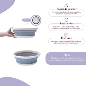 Conheça o Kit Lavanderia com 2 bacias dobráveis de plástico de 5L da Simplo.Multiuso, resistentes e fáceis de guardar, são ideais para organizar a lavanderia e economizar espaço. Possuem alça para facilitar o transporte, são retráteis com aros estruturados e diminuem a altura!É de PP / TPR. Limpe bem e seque a bacia antes de guardar. Evite deixar no sol ou perto de outras fontes de calor. Não use com água sanitária e outros produtos que contenham cloro, removedores, produtos à base de petróleo ou líquidos oleosos.Leve funcionalidade e modernidade para sua casa!O kit contém:2 Bacias dobráveis de plástico 5L Marca: SIMPLO