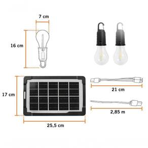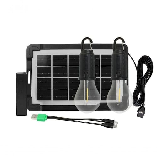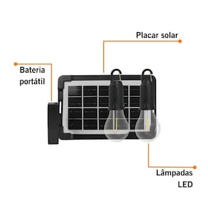 Itens inclusos: 1 painel solar; 2 lâmpadas LED sem fio; 1 mini carregador; 1 cabo USB-C com 3 saídas