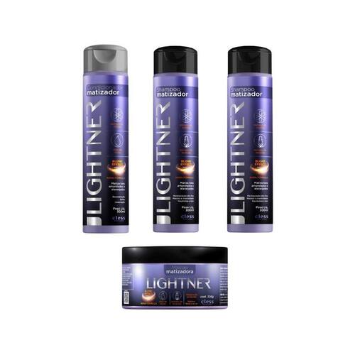 Kit lightner matizador - 1 condicionador + 2 shampoo + 1 máscara 300ml Descrição O kit lightner matizador oferece uma solução completa para cabelos loiros, grisalhos ou descoloridos. Com sua fórmula especializada, o kit atua para eliminar os tons amarelados e alaranjados indesejados, proporcionando cabelos com uma cor mais fria e brilhante. O conjunto composto por shampoo, condicionador e máscara, garante um tratamento eficaz e nutritivo, mantendo a cor e a saúde dos fios. Shampoo matizador 300ml : limpa profundamente, removendo o excesso de impurezas enquanto neutraliza os reflexos amarelados, proporcionando fios com tonalidade mais fria. Condicionador matizador 300ml : suaviza e hidrata os fios, além de intensificar a ação matizadora do shampoo, deixando os cabelos mais macios, sedosos e com brilho. Máscara matizadora 300g : proporciona uma hidratação intensa, reparando os danos nos fios enquanto matiza, deixando o cabelo com um tom mais natural e equilibrado, sem deixar o aspecto ressecado. Modo de uso Aplique o shampoo matizador nos cabelos molhados, massageando suavemente até formar espuma. Deixe agir por alguns minutos e enxágue completamente. Após o shampoo, aplique o condicionador matizador nos fios úmidos, espalhe bem e deixe agir por alguns minutos. Enxágue abundantemente. Para uma hidratação profunda, aplique a máscara matizadora nos cabelos úmidos e deixe agir de 5 a 10 minutos, conforme a intensidade do matizado desejado. Enxágue bem. Precauções: evite o contato com os olhos. Caso isso ocorra, enxágue com água em abundância. Uso externo. Marca: Não Informado Ean: 7908945259084
