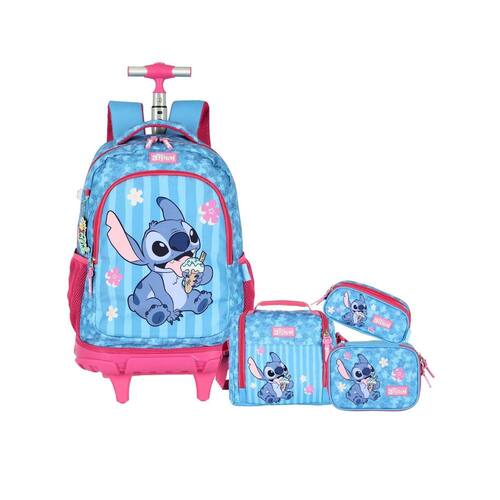 Kit mochila de rodinhas + lancheira térmica + estojo box + estojo triplo stitch & angel - floral azul e rosa, grande e super confortável a mochila de rodinhas stitch & angel é perfeita para quem quer estilo, praticidade e conforto na volta às aulas. Com design floral delicado, cores suaves e os personagens mais amados da disney, ela une fofura com funcionalidade de verdade. Características do produto Mochila de rodinha: