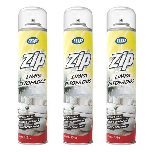 Kit Limpa Estofados Spray Zip Clean 300ml / 251g Remove Seco Quantidade: 3 O Zip Limpa Estofados foi desenvolvido para melhorar a eficiência na limpeza a seco.