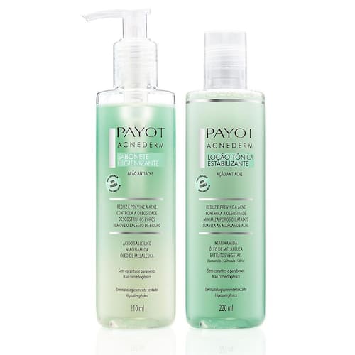 Kit Limpeza e Tonificação Acnederm Payot O Kit Limpeza e Tonificação Acnederm, contém: 1- Sabonete higienizante líquido facial acnederm 210ml O Sabonete Higienizante Acnederm Payot, foi formulado com Ácido Salicílico, Niacinamida e Óleo de , que conferem limpeza profunda eliminando as impurezas, sem irritar ou ressecar a pele. Controla a oleosidade excessiva, deixando a pele limpa e hidratada ao longo do dia. Desobstrui os poros. Diminui a vermelhidão e o inchaço causado pela acne. Seu uso contínuo ajuda na prevenção de formação de cravos e espinhas. Pele macia e com viço natural. Sensação refrescante. 1- Loção tônica estabilizante 220ml A Loção Tônica Estabilizante Acnederm Payot auxilia na redução da acne e previne a formação de novas espinhas. Possui ação adstringente e refrescante que limpa profundamente e controla a oleosidade ao longo do dia. Não resseca a pele. Sua fórmula enriquecida com Extratos Vegetais, Óleo de e Niacinamida minimiza os poros dilatados, combate a vermelhidão, suaviza as marcas de acne e acalma a pele. Vegano; Sem Corantes e Parabenos; Não Comedogênico; Dermatologicamente Testado; Hipoalergênico; Livre de ingredientes de origem animal e não testado em animais. Marca: Não Informado Ean: 7892382583348
