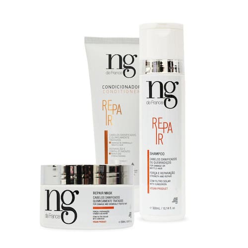 Desenvolvida para cabelos danificados e quebradiços, a Linha Repair repara, hidrata e fortalece através da reposição dos aminoácidos e proteínas nos fios. Seu ativo devolve hidratação e elasticidade proporcionando fios mais fortes e protegidos. Para cabelos danificados e quebradiços.Produtos 100% veganos.Possuí óleos essenciais.Propriedades hidratantes, nutritivas, revitalizantes, fortificantes e anti-frizzProduto 100% vegano e com óleos essenciais orgânicos.Benefícios da linha:- Repara os danos fortalecendo os fios- Restabelece a elasticidade e força- Alinha a cutícula diminuindo a porosidade- Proporciona brilhoKit com:- Shampoo 300ml- Condicionador 200ml- Máscara 250g