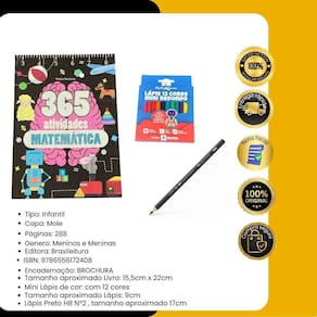 Contém : 1 unidade Livro Infantil 365 Atividades Educativas Matemática + 12 unidades mini lápis de cor + 1 lápis grafite 2/HB. Uma seleção de atividades de raciocínio matemático, associação e memorização, além de outros enfoques estão reunidas para divertir, instruir e estimular a criatividade e imaginação dos pequenos e vorazes leitores. Esta obra contém atividades de coordenação motora, letras, palavras, escrita, opostos, formas, números, operações matemáticas, desenhos para colorir, cruzadinhas, labirintos, ligação de ponto e muito mais Complete o aprendizado da criança, de forma lúdica, flexível e progressiva. Habilidades desenvolvidas: - Estímulo visual; - Concentração; - Coordenação motora; - Criatividade e Imaginação; - Reduz e ansiedade. - Raciocínio Lógico. - Conceitos Matemáticos. Autor: Todolivro Páginas: 288 Dimensões: 15,5 x 22 cm Formato: Brochura Faixa etária: 5 anos. Marca: BrasiLeitura Faixa etária: A partir de 5 anos ISBN: 9786556172408 Editora: BrasiLeitura Dimensões: 15.50 x 22.00 cm Idioma: Português Diversão Garantida: Com 365 atividades emocionantes, o livro promete transformar cada dia em uma nova aventura cheia de diversão e aprendizado. Desenvolvimento Criativo: Estimula a criatividade das crianças através de jogos, labirintos e desafios que incentivam a imaginação e o pensamento crítico. Variedade de Jogos: Oferece uma ampla gama de atividades, garantindo que as crianças nunca fiquem entediadas e sempre tenham algo diferente para explorar. Qual é a medida de cada lápis de cor Cada lápis possui 9 cm de comprimento, um tamanho ideal para as mãos pequenas das crianças, facilitando o manuseio. Qual é a medida de lápis hb Possui 17 cm de comprimento. Marca: Não Informado