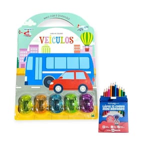 Contém : 1 unidade livro infantil de colorir veículos mais cor e diversão com 5 mini carrinhos + 12 mini lápis de cor
