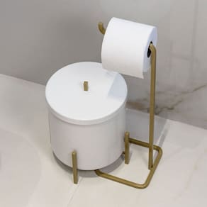 O porta papel, por sua vez, é produzido em aço com pintura epóxi eletrostática — tecnologia que proporciona alta resistência à corrosão e maior durabilidade. Disponível nas cores branco, dourado ou preto, ele possui estrutura robusta, altura de 47 cm e é entregue pronto para uso, sem complicações na instalação.