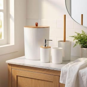 Kit Lixeira de banheiro com Dispenser e Escova Bambu 4 Peças Cor: Branco Transforme seu banheiro em um espaço mais prático e organizado com o Kit 4 peças com lixeira de Banheiro, dispenser, porta escova e escova sanitária. Este conjunto é ideal para quem busca funcionalidade e estilo, oferecendo tudo o que você precisa para manter seu banheiro limpo e arrumado. Com design moderno detalhes em bambu e cores que combinam com qualquer decoração, esse kit é perfeito para o seu dia a dia.