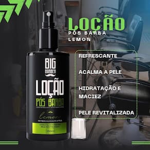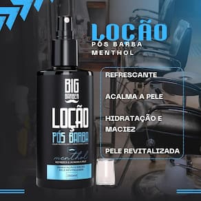 A Loção Pós Barba Big Barber profissional estimula a regeneração da pele nas áreas lesionadas Após o barbear, especialmente nas áreas em que a epiderme sofre mais lesões. Ideal para prevenir irritações e alergias na pele após a remoção dos pelos, Além de proporcionar uma deliciosa sensação refrescante à pele, deixando-a Agradavelmente perfumada.
