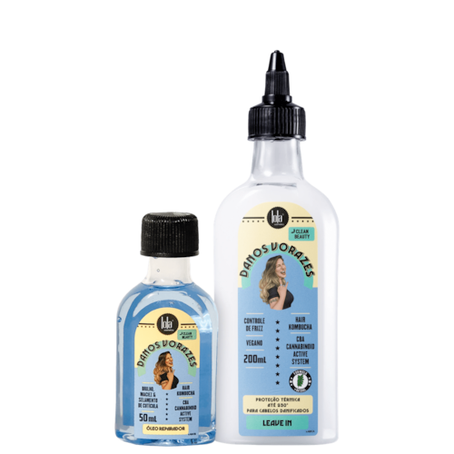 Kit com leave-in e óleo reparador para cabelos danificados. Lola Cosmetics Danos Vorazes Duplo repara os fios e protege contra danos térmicos e químicos.
